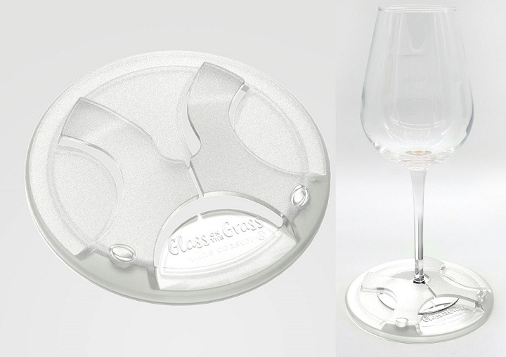 Glass on the Grass™ is the lightweight base that turns any wine glass into an outdoor glass that you can actually put down on grass, sand or stone making it perfect for picnics and parties. It’s perfect for picnics, BBQs, camping, pools & spas, beach holidays, outdoor events, outdoor cinema, outdoor weddings, camping, corporate picnics, corporate gifts.  It’s provides the perfect branding opportunity!