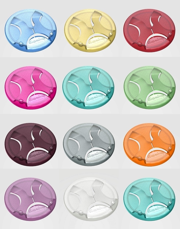 Clear, Black ( Smoke), Aqua, Light Blue ( Sky), Green ( Grass), Orange ( Tangerine), Red ( Ruby), Hot Pink, Violet, Gold and Pinot